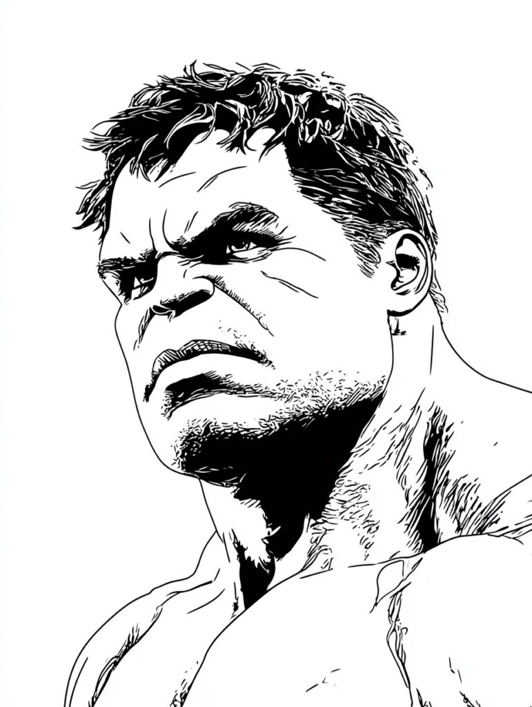 Unschwer zu erkennen, wird der Hulk für Marvel von dem Schauspieler Mark Ruffalo gespielt. In diesem Ausmalbild zeigt das Gesicht das beste aus zwei Welten. Drucke es aus und koloriere es nach deinen Wünschen.