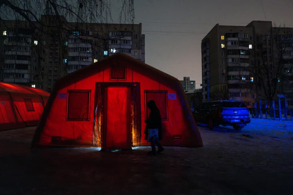 Die Bezirke am linken Ufer von Kiew sind am stärksten von Angriffen auf die kritische Infrastruktur betroffen. Ganze Wohngebiete bleiben im Dunkeln. In einem schneebedeckten Innenhof, umgeben von grauen Wohnblöcken, wird der Eingang zum mobilen Zelt von einer einzigen Lampe beleuchtet – begleitet vom stetigen Brummen eines Generators.